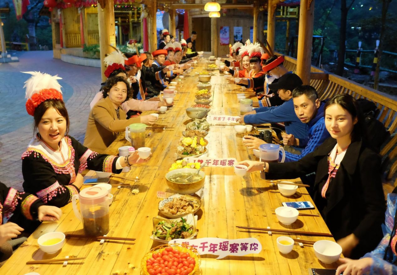 除了视听盛宴,自然还有美味佳肴,长桌宴堪称瑶族饮食的代表之作,是瑶族人沿袭千年规格最高、最隆重的传统宴席,千年瑶寨内设有瑶族长桌宴(2024年已获“国家版权登记”),一桌原汁原味的瑶族盛宴,让你感受“舌尖上的瑶味”。