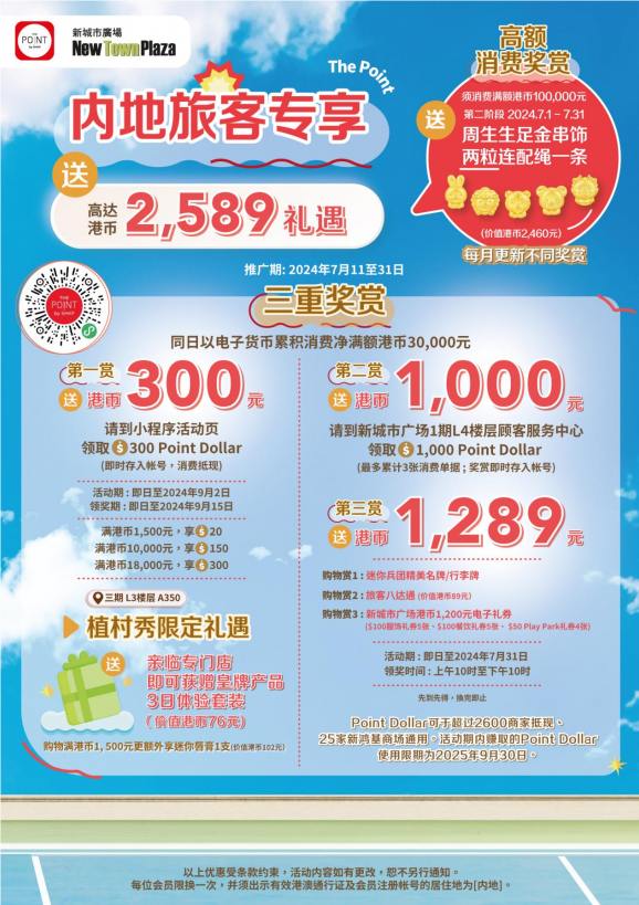最硬核的当属暑期档香港沙田新城市广场特别策划推出的「The Point 暑假旅客」内地旅客专享三重奖赏计划,高达港币2,589礼遇,消费满30,000港币即可获得额外三重礼加赠,福利超多,诚意满满。