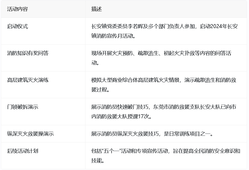 - 户外宣传活动:多个部门在户外设摊开展宣传活动、游戏互动和消防器材展示,吸引群众咨询和体验。