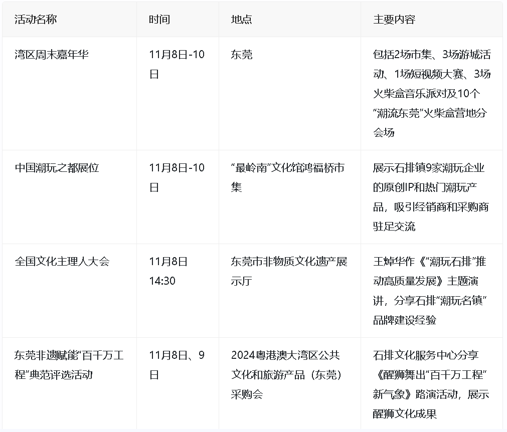 2024年11月8日至10日,粤港澳大湾区公共文化和旅游产品(东莞)采购会在东莞成功举办。期间,主办方推出了一系列文化活动,包括市集、游城活动、短视频大赛、音乐派对等,旨在通过文化赋能和文旅融合,推动岭南文化的创新发展。