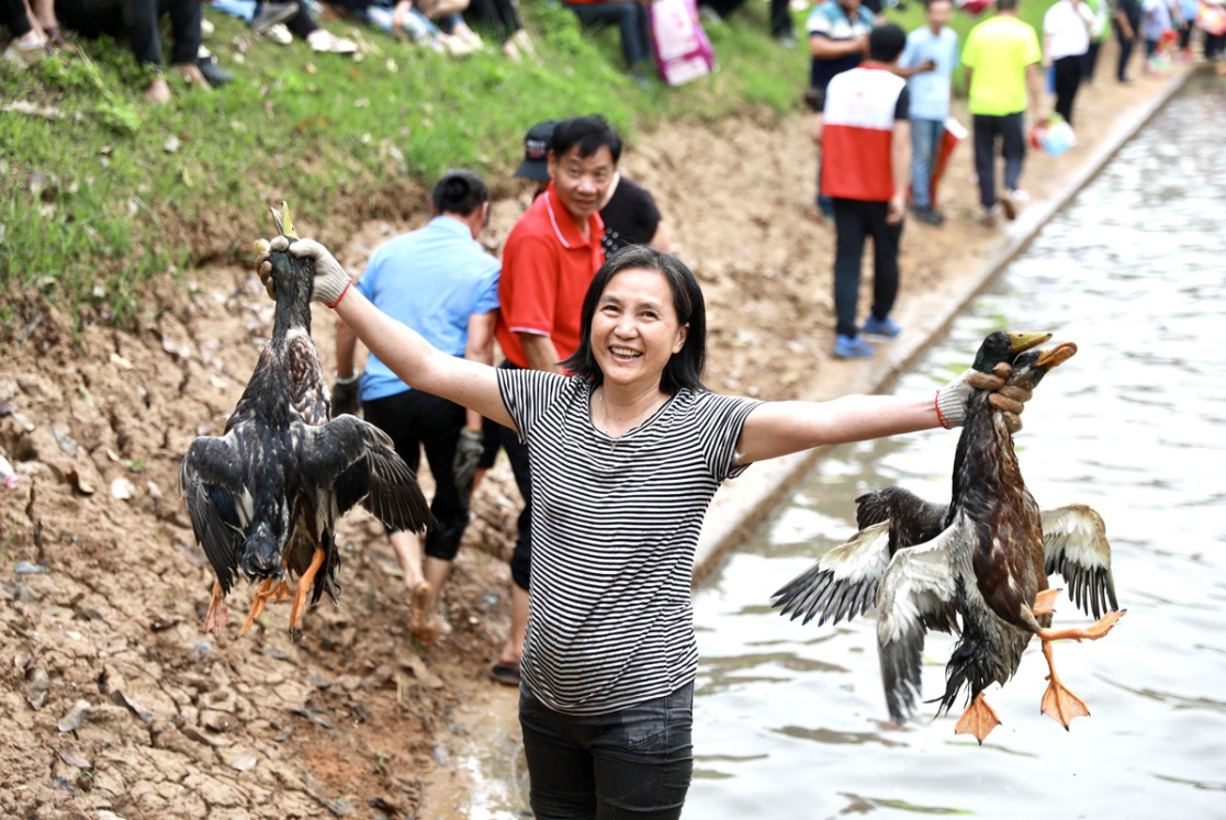 赛事组织者以"破坏性创新"思维突破传统框架:儿童拔河友谊赛中稚嫩手臂与粗粝绳索的视觉反差,制造出社交媒体传播的天然爆点;抓鸭摸鱼环节将农耕技能转化为沉浸式娱乐IP,参赛者扑入池塘激起的浑浊水花里,漂浮着都市人对田园生活的想象投射。来自大岭山的游客欧阳敏在泥水飞溅的赛场边缘高举直播设备,其抖音账号实时评论区被"这才是真乡村"的弹幕刷屏。