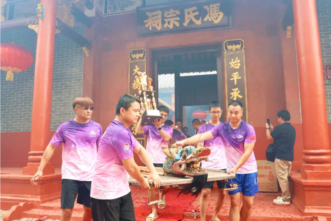 河岸沸腾的画面里,四十余名赤膊壮汉以肌肉贲张的原始力量托举龙身,岸边民众泼水相和的古老祝福穿透现代都市的钢筋水泥。当冯沛朝手持朱砂笔完成"三点龙鼻"的刹那,这条曾为东向村勇夺镇赛第四的功勋龙舟,在数字化时代完成从器物到文化图腾的涅槃重生。非遗传承人父子冯怀女、冯沛朝两代匠心的血脉赓续,在龙鳞的鎏金纹路间清晰可辨。