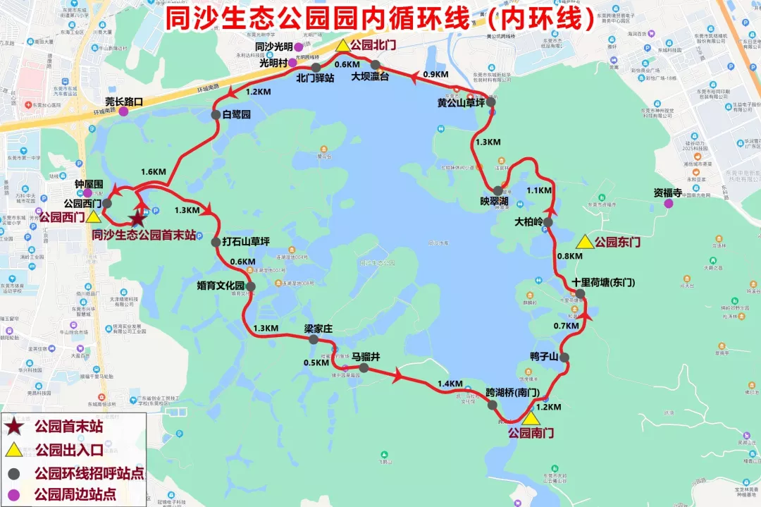 同沙生态公园园内循环线(内环线)主要在公园内逆时针循环营运,为公园内游玩的市民提供观光、接送服务。该线路连通了公园内15公里的绿道,途经黄公山草坪、映翠湖、十里荷塘、跨湖桥、打石山草坪等人气景点。市民可乘坐专线快速抵达下个景点或乘车休息观光。该线路将是我市首条在公园内部运营的公交线路。