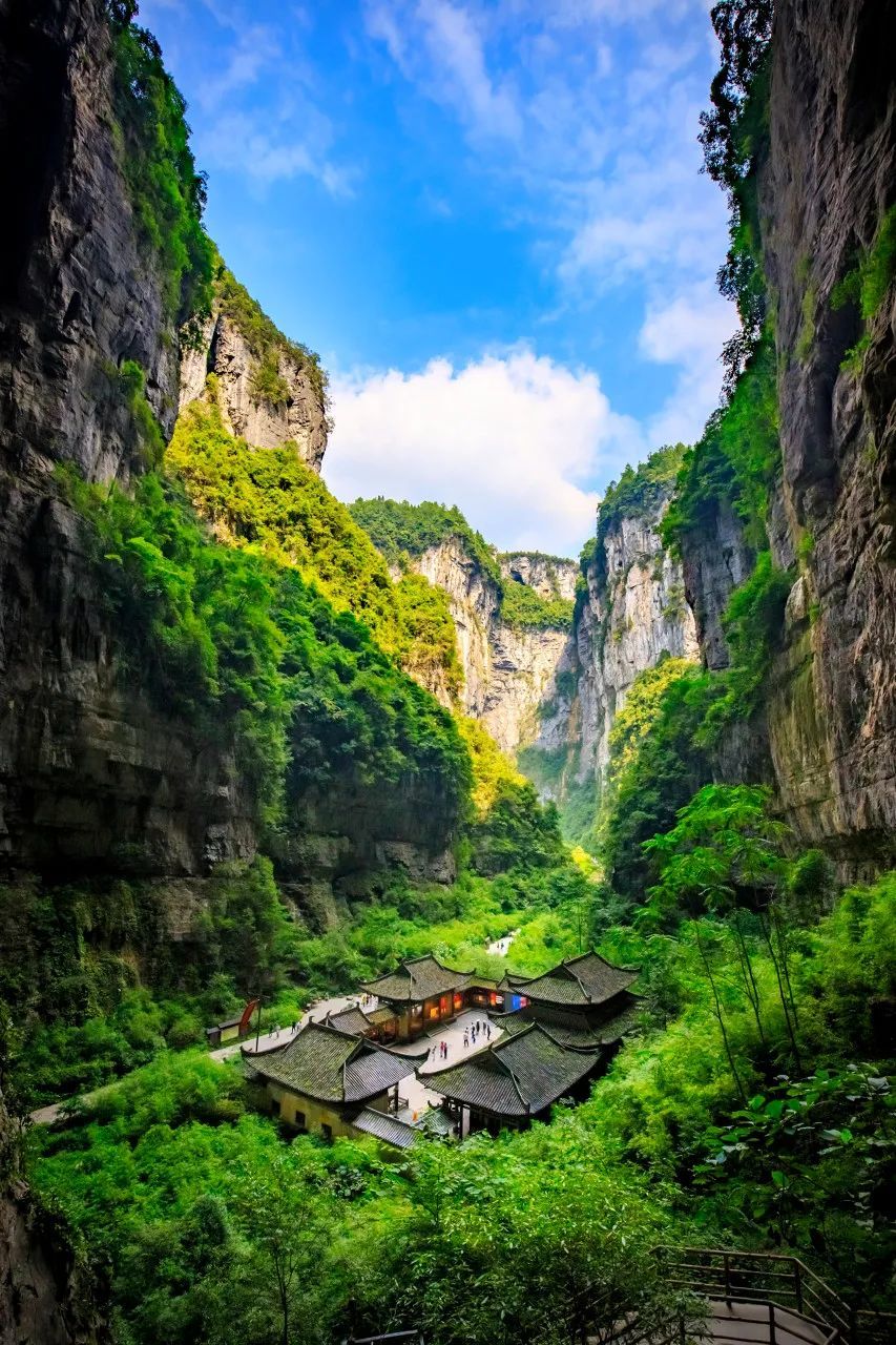 坑底景色慢慢出现在眼前,仿佛走入一片世外桃花源。