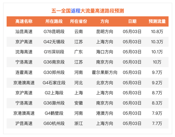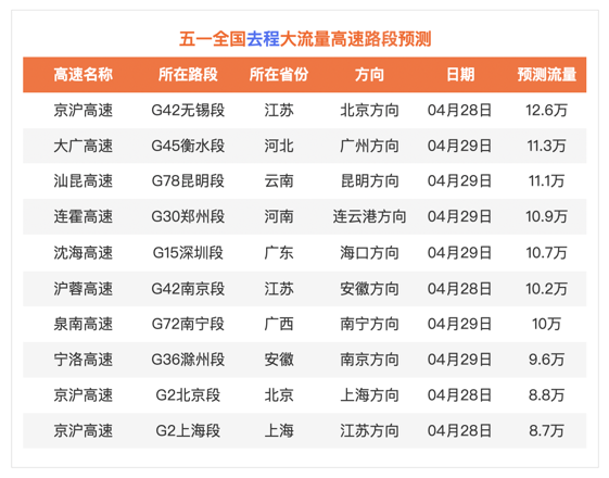 《报告》预测五⼀假期去程⼤流量⾼速公路路段中,京沪⾼速公路⽆锡段北京⽅向、⼤⼴⾼速公路衡⽔段⼴州⽅向、汕昆⾼速公路昆明段昆明⽅向的车流预计将超11万辆次。返程⼤流量⾼速公路路段中,汕昆高速公路昆明段昆明方向、京沪高速公路无锡段上海方向、沈海高速公路深圳段海口方向的车流量预计将超10万辆次。