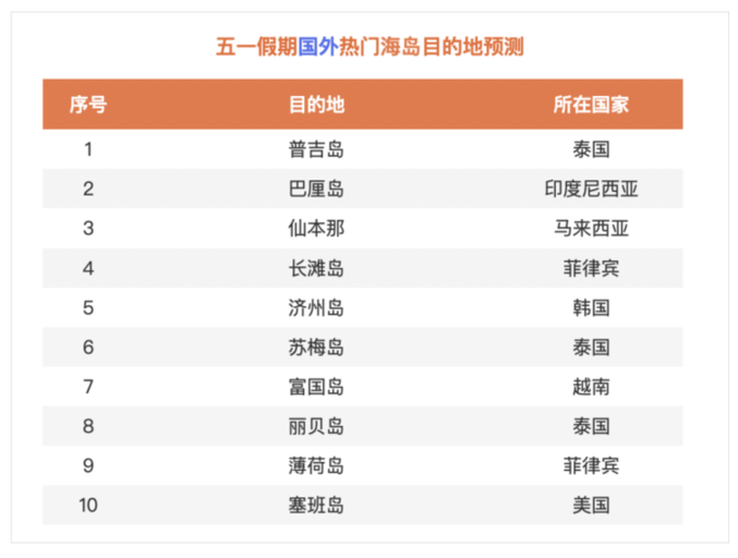 以泰国为代表的东南亚国家依旧是⼤多数游客“新拥抱世界”的第⼀站。 得益于大众对于“做个岛民”的海岛游向往,旅游业发展成熟的普吉岛、巴厘岛、仙本那、长滩岛、济州岛在国外热⻔海岛预测榜中名列前茅。同时,诸如马来西亚邦咯岛等保有原⽣态风情的⼩众岛屿也在今年五⼀吸引了不少旅游者的目光,近期的热度涨幅⾼达200%。