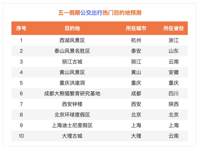 《报告》预测,今年五⼀期间各个景点⼈流⻋流都将增长,景区周边的停车成本将增⾼。更多游客会选择公共交通、共享单车等绿色出⾏方式,预计西湖风景区、泰山风景名胜区、丽江古城、黄山风景区、重庆洪崖洞等地的绿色出⾏⽕热。