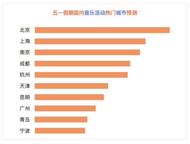 五一假期全国各地的⾳乐活动百花齐放,去⼤型场馆看⼀场演唱会、去遥远的城市听⼀次⾳乐节,也是五⼀出游的热点之⼀。根据百度⽹页和搜索⼤数据,五⼀假期北京、上海、南京、成都、杭州等地的⾳乐类活动出⾏热度位居前列。