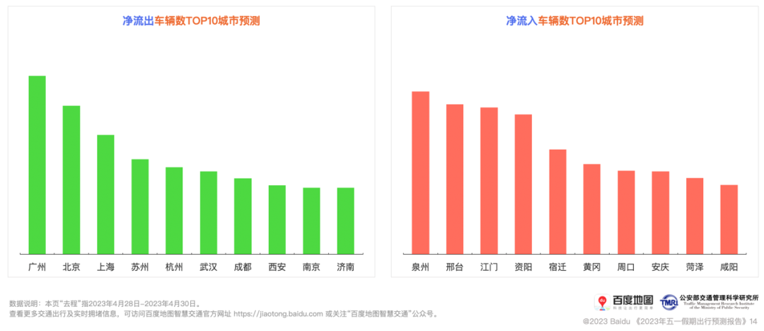 自驾出游的公众可以关注:《报告》预测五⼀假期去程期间,车辆累计净流出城市TOP3为⼴州、北京、上海;车辆累计净流⼊城市TOP3为泉州、邢台、江门;热门⾼速公路跨城出⾏路线预计分布在⼴东、北京、上海、江苏、浙江、⼭西、⼭东、四川的邻近城市之间。
