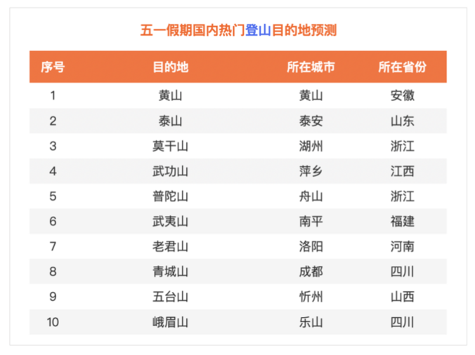 此外,由于五⼀假期正逢春夏之交,适宜的⽓温让⾃然类景区,以及亲近⾃然的徒步、登⼭等户外玩法进入⼤众视野,各地“徒步”热度涨幅超60%。在今年春天年轻人“寺庙游”风潮的带动下,预计今年五一期间普陀山、五台山、峨眉山几大佛教名山将上榜热门登山目的地。