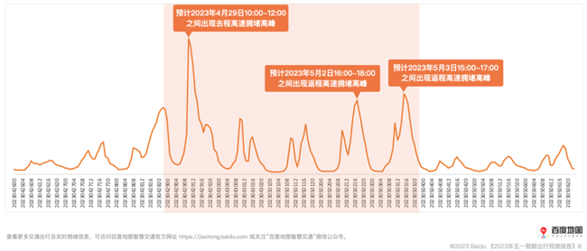 预计五⼀假期⾼速公路拥堵程度整体较去年同期上升。假期第一天或出现人口迁徙、高速公路拥堵双高峰,五⼀假期⾼速公路拥堵峰值预计出现在4⽉29⽇10:00-12:00,这或许是整个五⼀假期⾼速公路拥堵的最⾼峰。预计5⽉2⽇的16:00-18:00、5⽉3⽇的15:00-17:00之间将出现返程⾼速公路拥堵⾼峰。