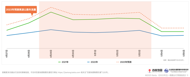 同时,参照往年五⼀假期⾼速公路车流变化趋势特征,综合考虑近期⾼速公路交通流⼤幅上升、踏青出游热情⾼涨、⾼速公路免费通⾏等因素,《报告》预测2023年五⼀假期⾼速公路整体车流同⽐2021年、2022年将分别上升超15%、110%,较平时将上升超100%。