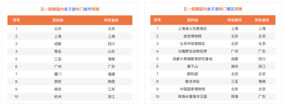 北京凭借深厚的历史⽂化底蕴和知名主题乐园,预计将成为亲⼦家庭出⾏的⾸选城市。青岛、三亚、厦⻔等海边城市也是家长们⼗分热衷的带娃目的地。北京故宫博物院、北京环球度假区、⼴州⻓隆动物世界、成都⼤熊猫繁育研究基地、莫干山等景区预订⽕爆。