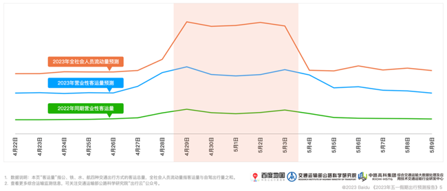 《报告》预测,五⼀假期,全社会⼈员流动基本持续处于⾼位,全国客运量较2022年同期⼤幅增长、将达到2019年以来同期最大值。