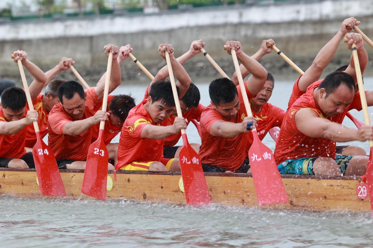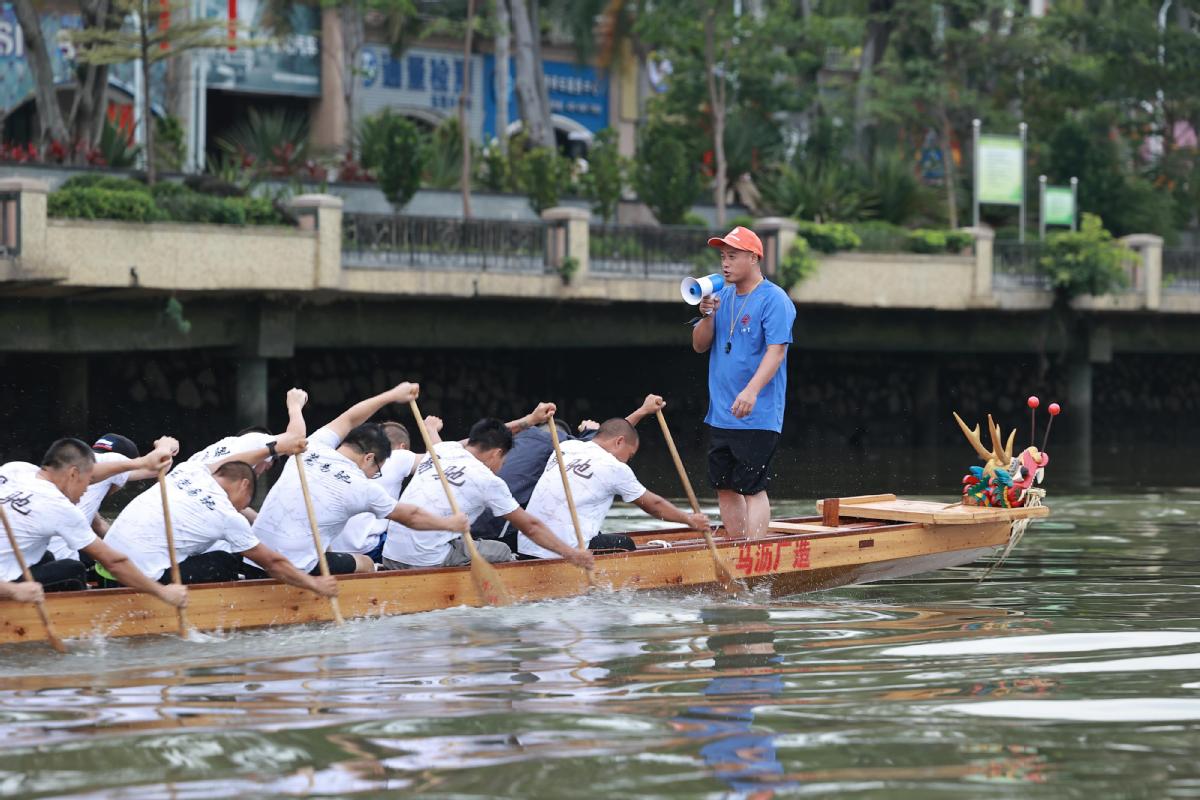每日下午,北海河旁,九曲村江边街就会逐渐热闹了起来,九曲龙舟队队员陆陆续续来到这里,签到,热身,开启当天的训练。龙船下水后,九曲龙舟队队员们在节奏有力的鼓声号子下,奋力划桨,龙舟如离弦之箭在河面上劈波斩浪。