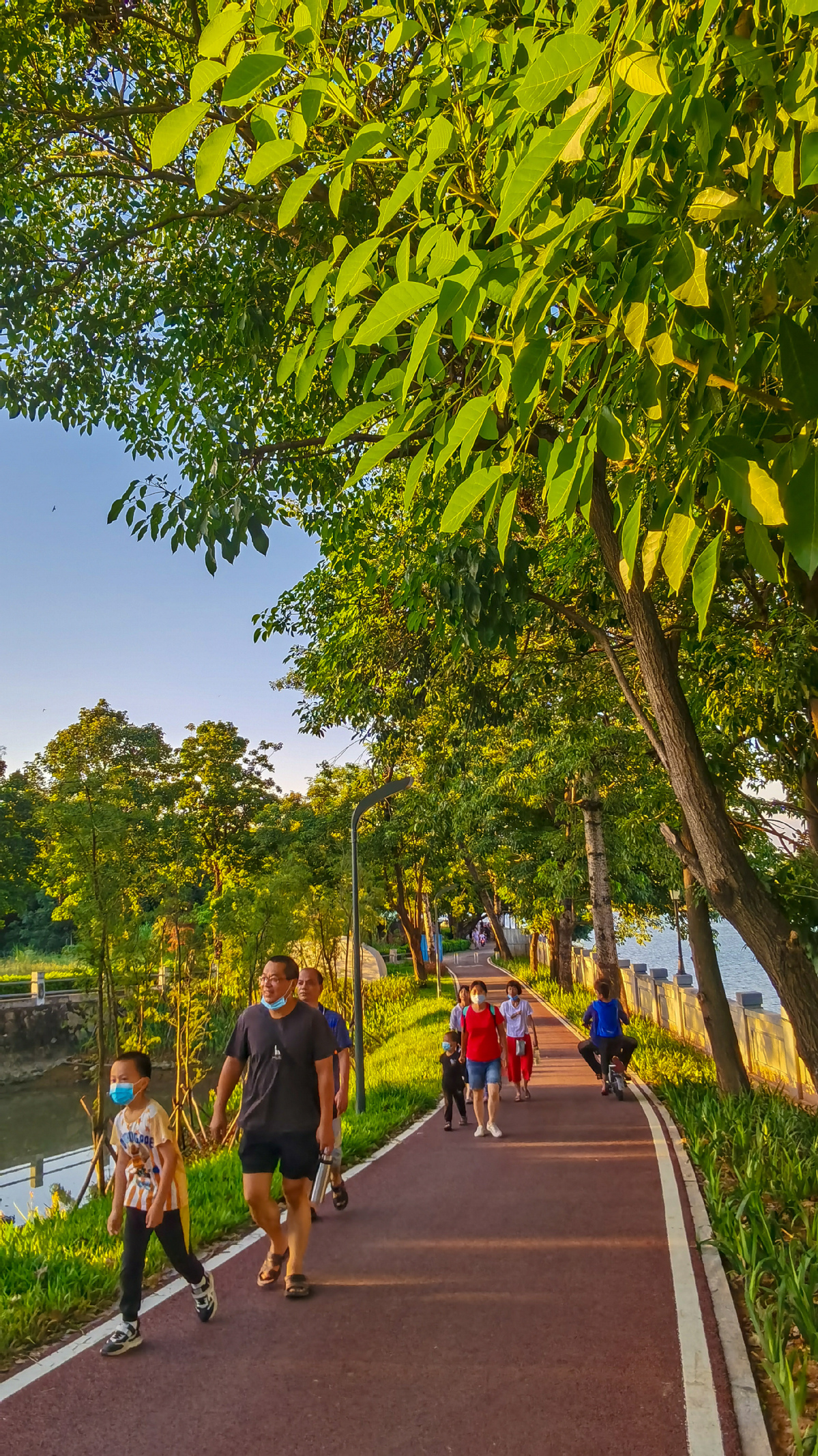 依托沿江碧道,还建起了沿江公园。每到傍晚,只见沙滩上游人如织,绿道上繁花似锦,春意盎然,人们或在绿道上跑步、骑行,或三五知己在草坪上露营,也有一家大小在儿童天地游玩,处处充满孩子们的欢声笑语。游戏场地内配置了沙坑、戏水设施,在保障安全的前提下,配置了满足儿童玩乐、攀爬等需求的游玩设施。