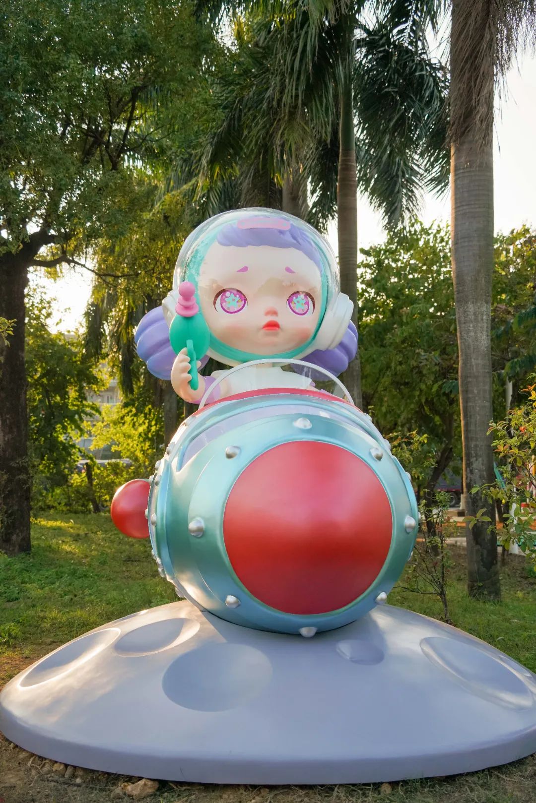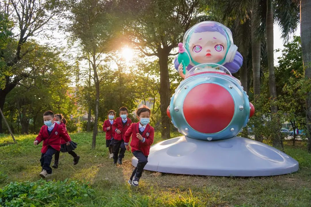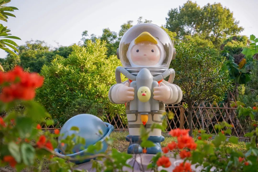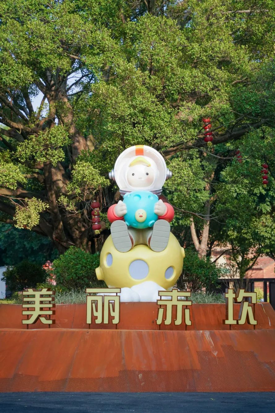 石排原创潮玩IP Laura、Sueno、Mr'Pa化身航天员“入住”赤坎村,受到了村民和游客的喜爱,穿过赤坎村门楼就可以看到身穿航天服驾驶航天飞船的Laura,坐落于右前方的草坪上。