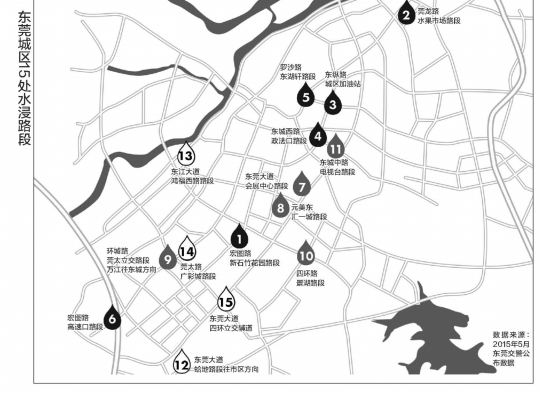 为什么这些黑点逢雨必涝?东莞水务部门解释,因为城区排水管用的一般是1年一遇的标准。16大排水系统,将暴雨积水排到运河,但总有积水在途中“卡脖子”。