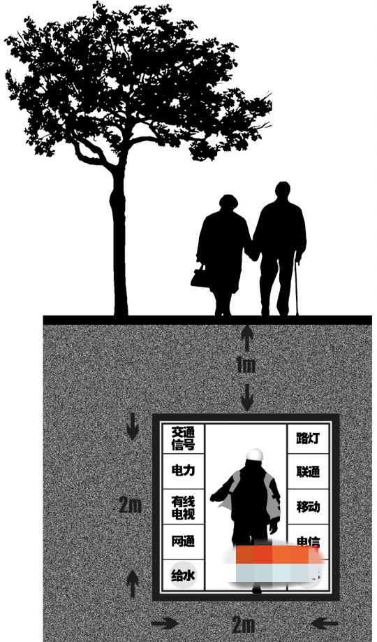 如示意图所示,在地下1米之外,一个长2米宽2米的管道,就是一条“管线高速”,管线在里面不再是如蜘蛛网般的错综复杂,而是有序排列。比如左侧是给水、电力、交通信号、有线电视等5类管线,右侧是排水、路灯、联通、移动等另外5类管线。中间空出的空间虽然不能跑车,可是至少能站人,方便今后建设和管理。