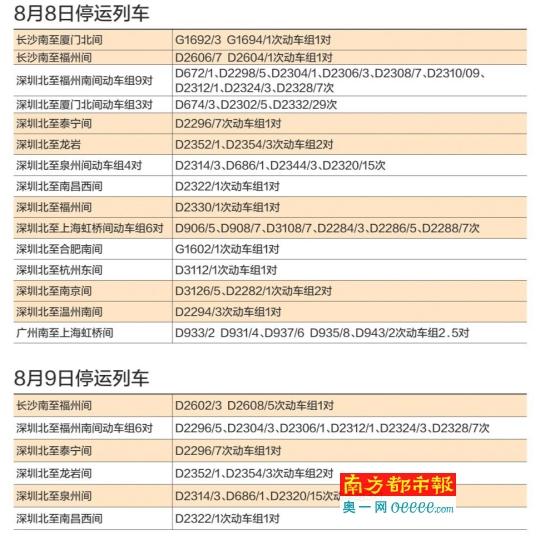 从停运车次来看,深圳北站发出的动车停运量要多于广州。据了解,停运路线主要集中在深圳北站开往福州南、厦门北、泰宁、泉州、南昌西、温州南、合肥南、杭州东、南京、上海虹桥等方向。深圳北站8月8日停运32趟,8月9日停运13趟。