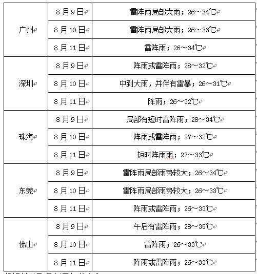 8日下午到9日,梅州、河源、汕头、潮州和揭阳(雷)阵雨转大雨到暴雨,其余市县晴到多云,有(雷)阵雨。8日最高温度:东部市县33℃~35℃,其余市县34℃~37℃。