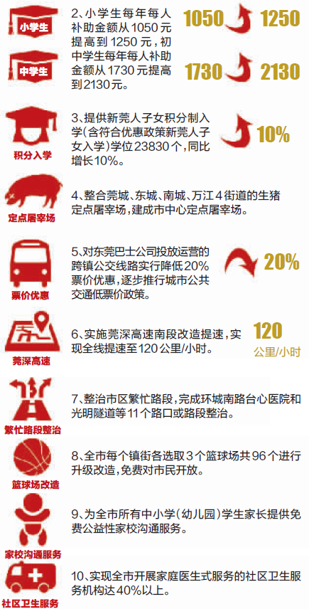 坐跨镇公交,票价也要降了。十件实事透露,对东莞巴士公司投放运营的跨镇公交线路降低20%的票价优惠,逐步推行城市公共交通低票价政策。