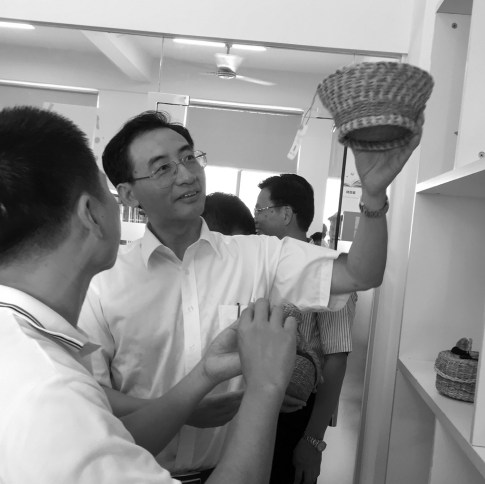 潘新潮一行参观立沙新区,手中拿着广东非遗“莞草编织”。记者 梁锦弟 摄