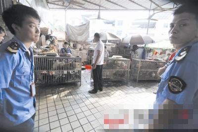 执法工作人员对活禽经营档主劝导教育。记者 陈栋 摄