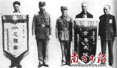 抗战期间,粤北广东省军民合作运动中民众代表向军队将领献旗致敬。右三为蒋光鼐。