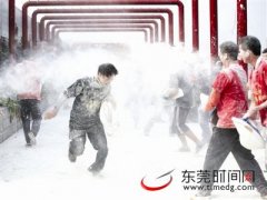 “面粉run”现场,这个小伙被一桶面粉袭击。图片均由东莞时报记者 赵浛锐 摄 被人撒面粉,也要撒别人面粉。 这两位被撒了一脸面粉,但还是很淡定。 大...