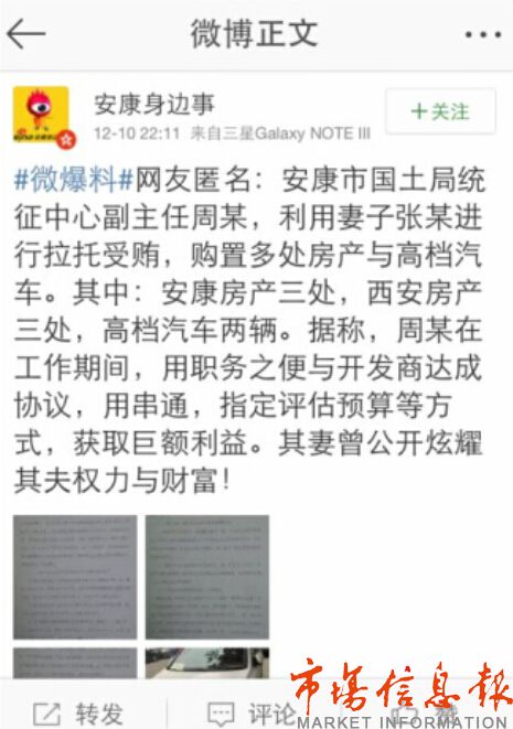 12月10日新浪“安康身边事”官方微博博主称:接到实名举报安康国土局统征中心副主任周远文夫妻的问题后,我们也进行过核实,发现许多举报内容属实。微博发出后有律师发来了私信,要求博主提供谁是举报人,并以侵犯隐私权为由要求删除微博,否则就走法律途径。