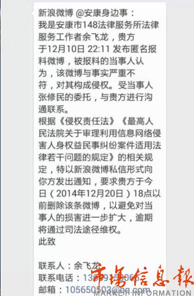 对此本报记者联系发私信的余飞龙律师,据余律师称:要求删除微博有此事,当事人张修民是安康国土局统征中心副主任周远文爱人。网上举报内容涉及个人隐私问题,已经对当事人心灵造成伤害。我们遵照张修民的个人请求给新浪安康身边事私信发了律师函。据记者了解,此微博目前并未删除,点击阅读量已经上万,有网友评论,安康市国土局统征中心副主任周远文作为政府官员,理应向公众和组织说明自己房产的正当来源。
