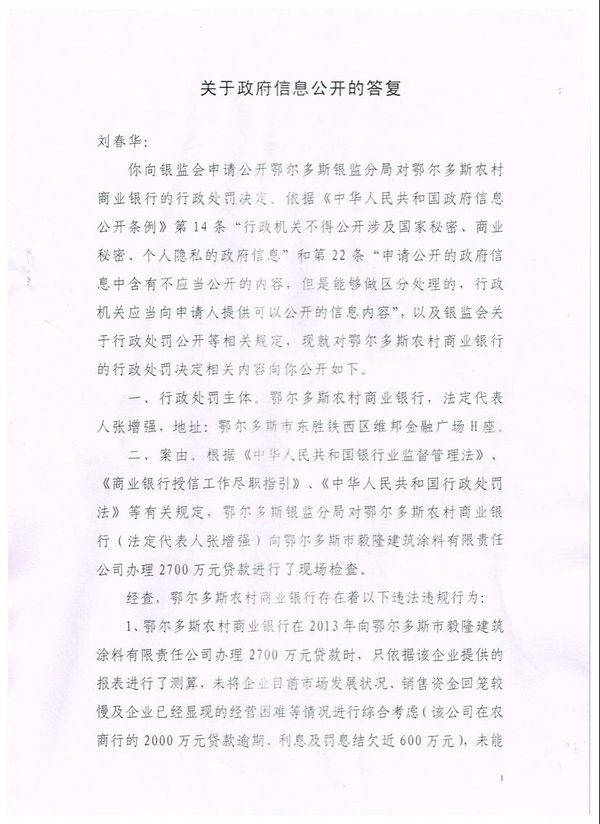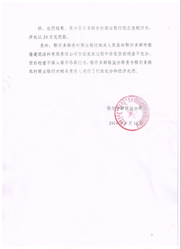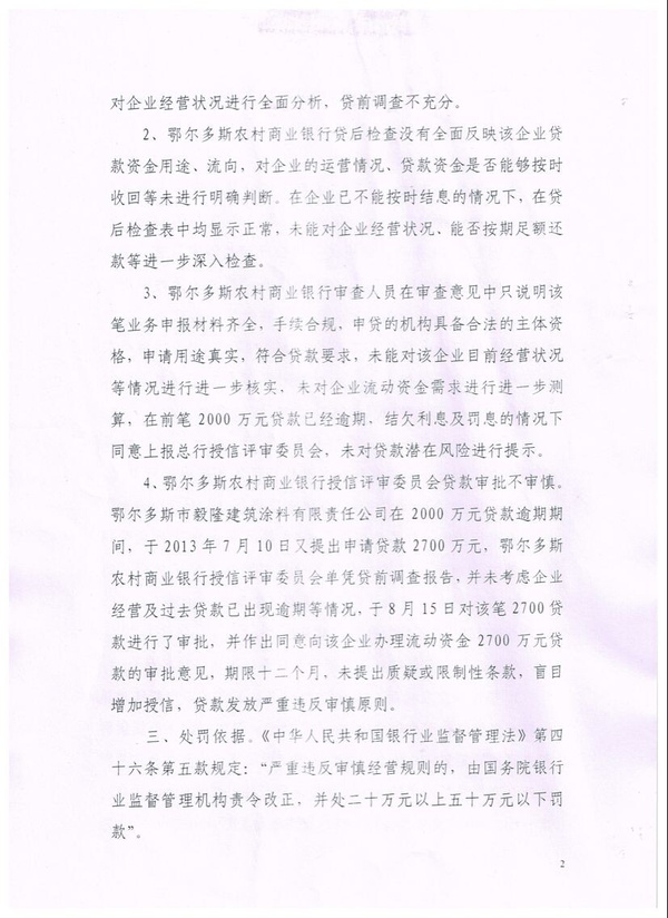 鄂尔多斯农村商业银行故意违反《国务院关于进一步加大工作力度确保实现“十一五”节能减排目标的通知》(国发〔2010〕12号)文件精神,向未经环评、非法违法生产企业鄂尔多斯市毅隆建筑涂料有限责任公司两次发放4700万贷款,然而中国银监会鄂尔多斯监管分局仅最后一次2700万贷款予以罚款20万元。