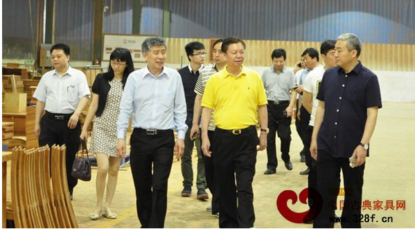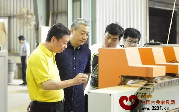 在国寿红木董事长陈国寿(前排中)陪同下,考察团一行来到二厂生产基地实地考察