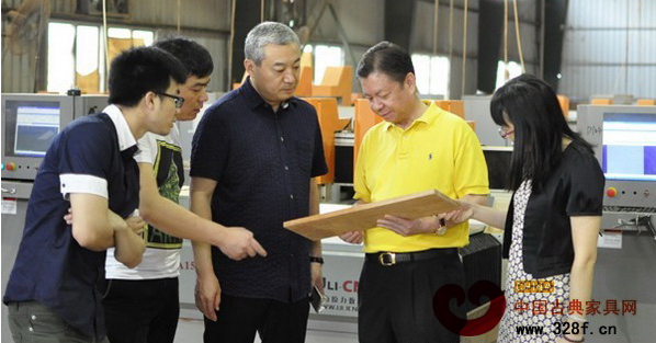 东莞市鸿普轩家具有限公司(以下简称国寿红木)二厂生产基地参观,国寿红木董事长陈国寿、副总经理何伟权接待了考察团并向他们详细介绍国寿红木产品从选材到制作的所有工艺流程。