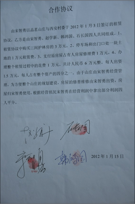 生意一直不错,却入不敷出,是什么原因导致的?“他们吃饭从来都是不给钱的。”郭振敏说。郭振敏口中的这些人,是指丈夫宋某和他的三个朋友。原来在酒店开业之初,宋某与石xx、赵xx、韩xx等四人签订了一份《合作协议》,协议中注明“由宋某以品茗山庄与西安村委于2012年1月3日签订的租赁协议,乙方是由宋某、赵xx、韩xx、石xx四人共同组成……每人出资1.5万元,每个人占有整个资产的四分之一。由于山庄由宋某经营管理,为方便整个山庄的规划建设,房屋的修缮(原文为善)维修由宋某出资,房屋归宋某使用,根据经营状况宋某在经营利润中拿出部分利润四人平分”。