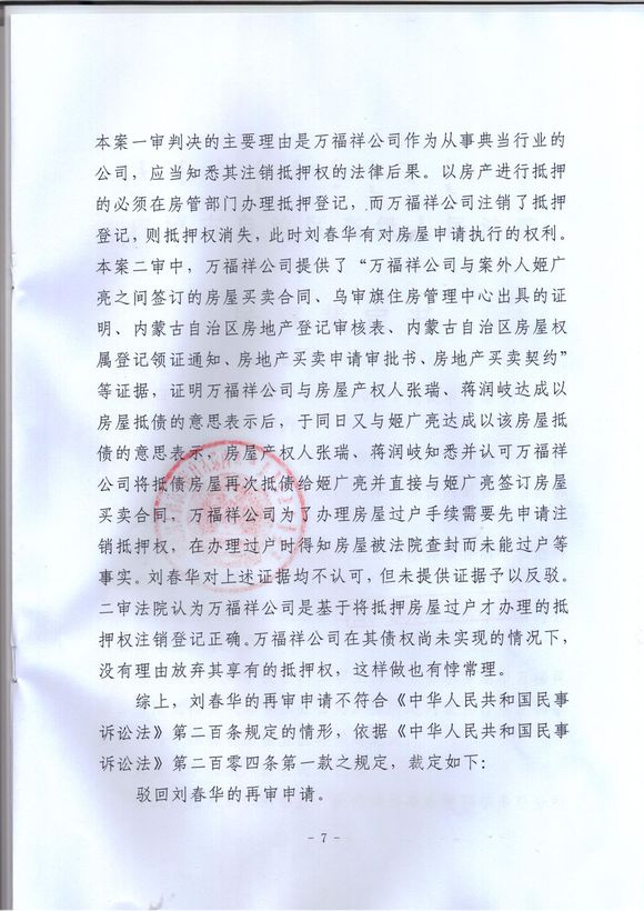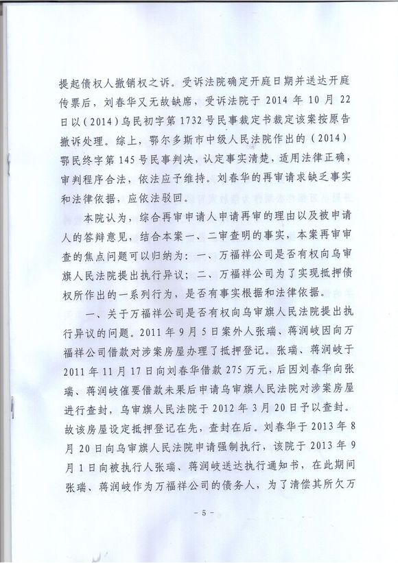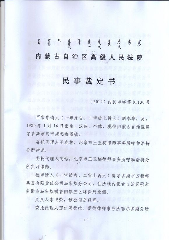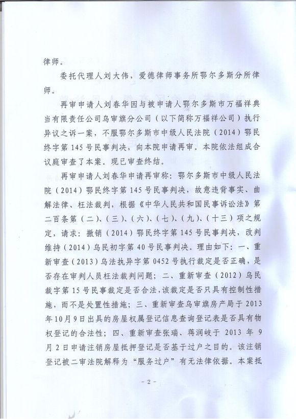 刘春华对鄂尔多斯市中级人民法院(2014)鄂民终字第145号民事判决不服,向内蒙古自治区高级人民法院提出再审申请。内蒙古自治区高级人民法院组成合议庭审理了此案。