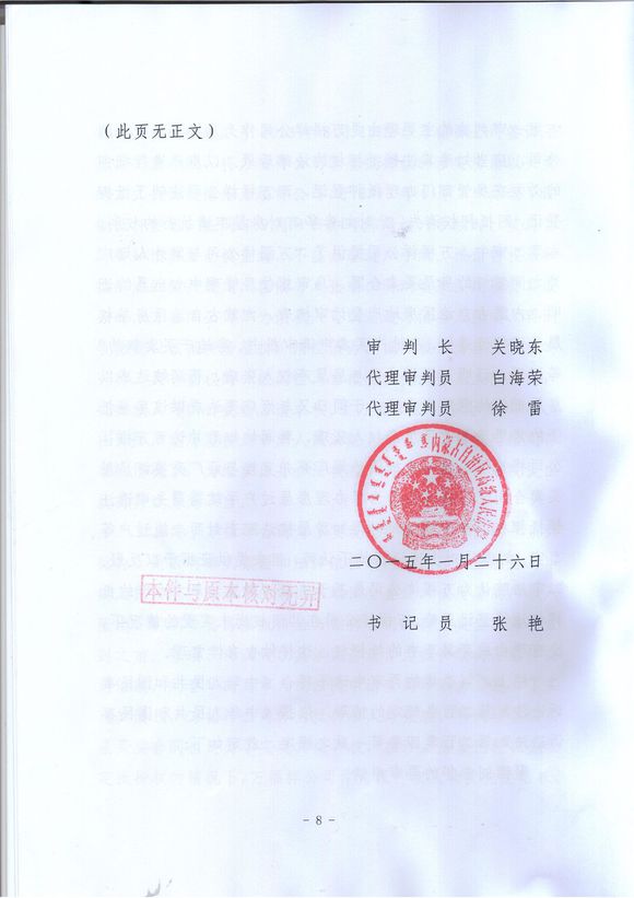 我们希望引起内蒙古自治区高级人民法院和最高人民法院党委的高度重视,切实加强审判监督,提高审判质量,认真贯彻《中共中央关于全面推进依法治国若干重大问题的决定》精神,内蒙古自治区高级人民法院审判人员故意违反法定程序枉法裁判的行为,依法给予严肃处理,裁定再审,对企图通过诉讼、调解等方式侵害他人合法权益当事人依法追究责任,确保政令畅通,依法推进司法公正和司法权威,为推进依法治国作出积极贡献!