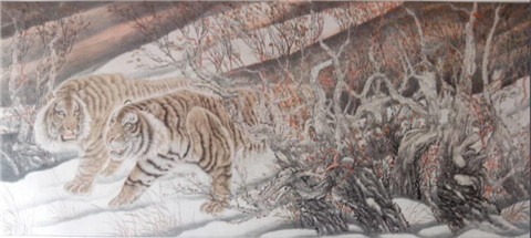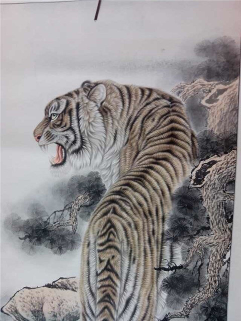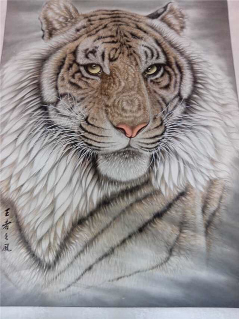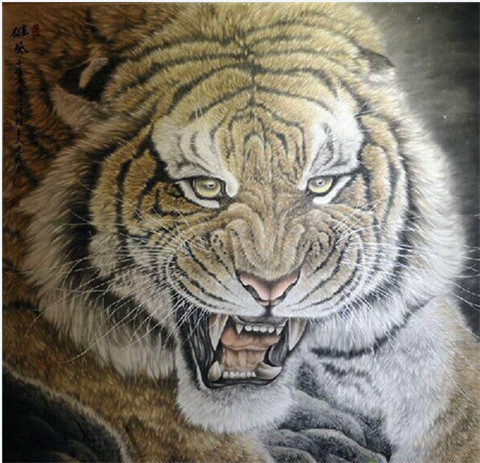 “小虎王”王建峰笔下的虎在继承前人传统画法基础上又不缺乏创新,把现在画虎的成熟技法与古代画虎之精粹完美结合在一起,创作了画虎作品中:有的虎不怒自威,颇有王者风范;有的华丽光鲜,展现出外在的形态之美;有的神秘莫测表情肃穆,让人难以揣摩;有的明敏谨慎,祥和中透着一种沉稳大气。
