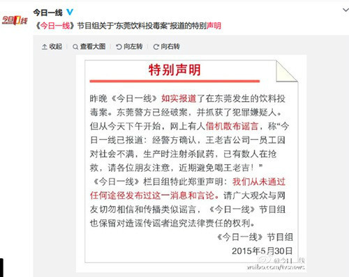 5月29日晚,《今日一线》如实报道了在东莞发生的饮料投毒案,但从30日下午开始出现散布网络谣言的现象,称“今日一线已报道:经警方确认,王老吉公司一员工因对社会不满,生产时注射老鼠药,已有数人抢救,请各位朋友注意,近期避免喝!”对此,《今日一线》已在官方微博、微信平台发出特别声明,表示从未通过任何途径发布这一消息和言论,并保留对造谣者追究法律责任的权利。