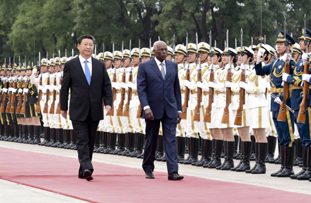 6月9日,国家主席习近平在北京人民大会堂同安哥拉总统多斯桑托斯举行会谈。会谈前,习近平在人民大会堂东门外广场为多斯桑托斯举行欢迎仪式。