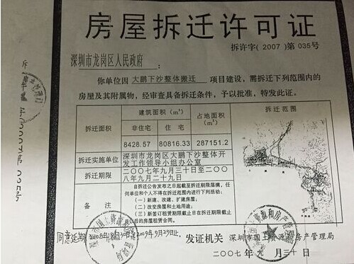 此外,最让村民难以接受的是大鹏街道办在征地拆迁过程中使用的是2007年的拆迁许可证(许可证号:拆许字(2007)第035号)。而该许可证在2009年已过期,大鹏办事处在明知拆迁许可证已过期的情况下,却仍多种手段开展搬迁工作。