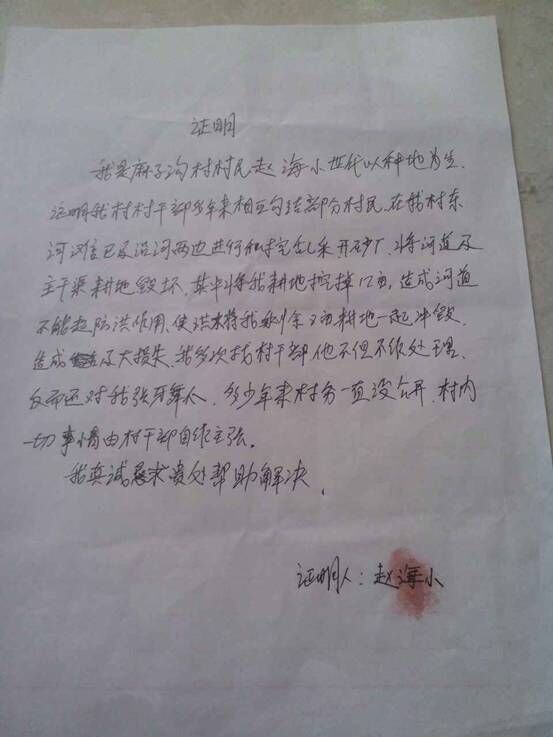 在媒体关注报道了刘伟之事后,麻子沟村民赵海小向记者反映,村支书刘伟勾结部分村民私挖乱采,毁坏了他家耕地12亩,由于村东河道以及大面积耕地被掏空,致使他家8亩耕地被洪水冲毁,根本无法耕种。他曾经多次向刘伟反映,要求给予解决,但是刘不但没有解决,反而还威胁他。