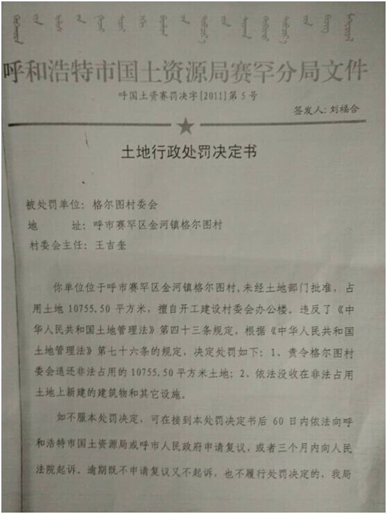 记者在行政处罚告知书和土地行政处罚决定书中,看到呼市赛罕区金河镇格尔图村,未经土地部门批准,占用土地10755.50平方米,擅自开工建设村委会办公楼。违反了《中华人民共和国土地管理法》第四十三条规定,根据《中华人民共和国土地管理法》第七十六条的规定,决定处罚如下:1、责令格尔图村委会退还非法占用的10755.50平方米土地;2、依法没收在非法占用土地上新建的建筑物和其他设施。