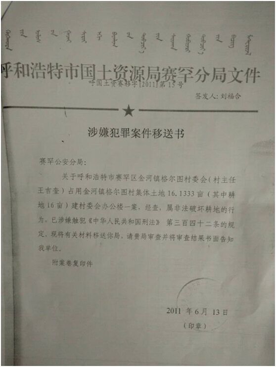 记者在一份涉嫌案件移送书中注明呼和浩特市赛罕区金河镇格尔图村委会(村主任王吉奎)占用金河镇格尔图村集体土地16.1333亩(其中耕地16亩)建村委会办公楼一案,经查,属非法破坏耕地的行为,已涉嫌触犯《中华人民共和国刑法》第三百四十二条的规定。