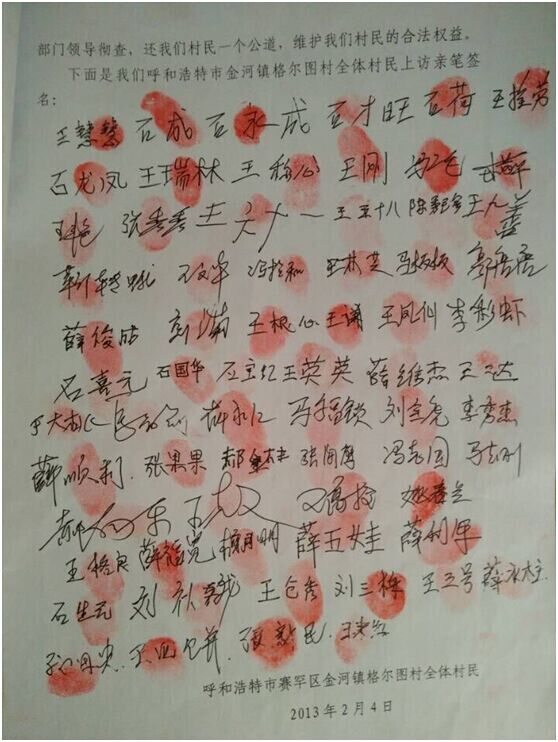 赛罕区金河镇格尔图村全体村民签了字摁了指印的举报材料中,记者看到郝平柱被检举九大罪证: