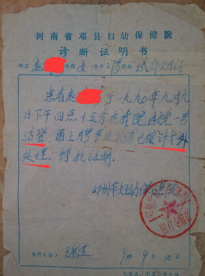 终于有一天赵女士在整理东西的时候发现一张发黄的医院诊断证明,突然觉得找孩子又有了希望,就鼓起勇气再次找到王新芝询问孩子的下落,得到的结果是孩子生下来就被抱走了时间长记不清楚了,之后不了了之,避而不答。
