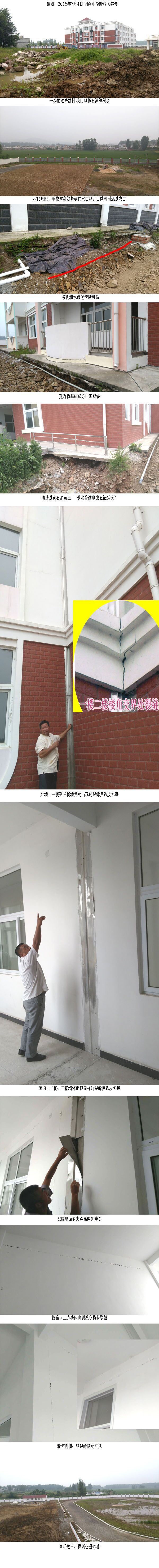 与其截然相反的是,新校区的教学楼和幼儿园楼同时出现如上图所示的严重质量问题。记者咨询一位建筑工程师,他看了所有的照片后直截了当一句话“危房”。室内外均出现大面积的缝隙,不是粉刷层问题,基本判断是建筑基础部分不实,造成了不均匀沉降,更危险的可能是施工方偷工减料没有建设基础梁或基础梁已经断裂,即使没有大的震动,也有随时倒塌的危险。“施工单位一般不敢在地基上做鬼的,有点不可思议”。该位工程师补充说,建筑质量最终需要有鉴定资质的机构全面检测,然后才能做出结论,责任终身制,特别是学校,谁也不敢口头打包票。(王中善)