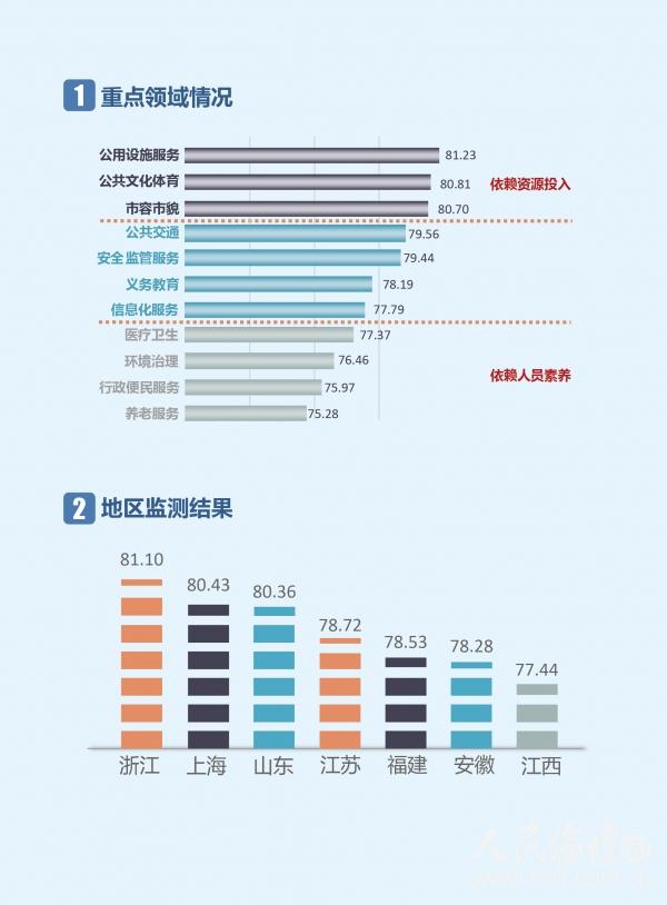 监测结果显示,华东地区公共服务质量整体满意度为78.82,处于“比较满意”水平。地区得分从高到低依次为浙江(81.10)、上海(80.43)、山东(80.36)、江苏(78.72)、福建(78.53)、安徽(78.28)、江西(77.44)。领域得分从高到低依次为公用设施服务(81.23)、公共文化体育(80.81)、市容市貌(80.70)、公共交通(79.56)、安全监管服务(79.44)、义务教育(78.19)、信息化服务(77.79)、医疗卫生(77.37)、环境治理(76.46)、行政便民服务(75.97)、养老服务(75.28)。
