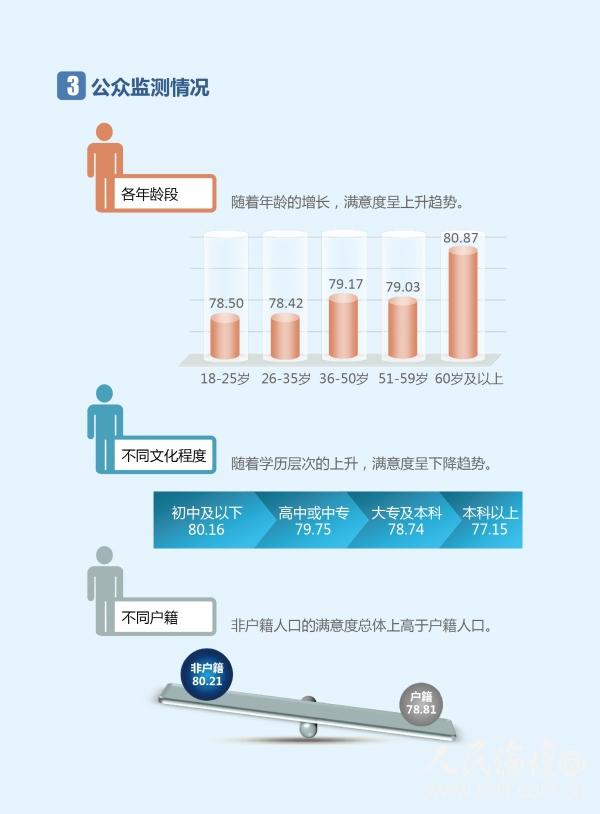 监测发现,近年来,尽管华东地区公共服务质量在不断提升,但是在养老服务、行政便民、环境治理等领域,还存在一些亟待解决的问题。养老服务满意度在11个监测领域中得分最低。51至59岁人群对养老服务的满意度最差(73.29)。被访者最不满意的是“申请入住公立养老机构”,得分为73.76,普遍反映公立养老机构资源少,缺乏公平合理的入住评估标准,操作不透明、不规范,一些急需入住的高龄、病弱老年人难以申请入住。在行政便民服务领域中,“行政事务办理效率”的得分最低(75.40)。18至25岁和26至35岁的人群对行政事务办理效率的满意度最低(分别为74.43和74.48)。被访者反映最为突出的问题是“事难办”,一些政府行政事务受理窗口程序不公开或者太繁琐,规范性较差。在环境治理领域中,“对环境污染的监测、监督和管理到位”指标得分为75.37。在对不同污染源治理效果的公众满意度中,从低到高依次为空气质量治理(76.28)、污水、污染物等排放治理(76.68)、居住与工作场所的噪声治理(79.42)。在医疗卫生领域中,“在本地看病的医药费负担”得分最低,为74.35。被访者意见建议中涉及医疗保障问题的达12.5%,最主要的是“增加医疗服务的公共投入”。